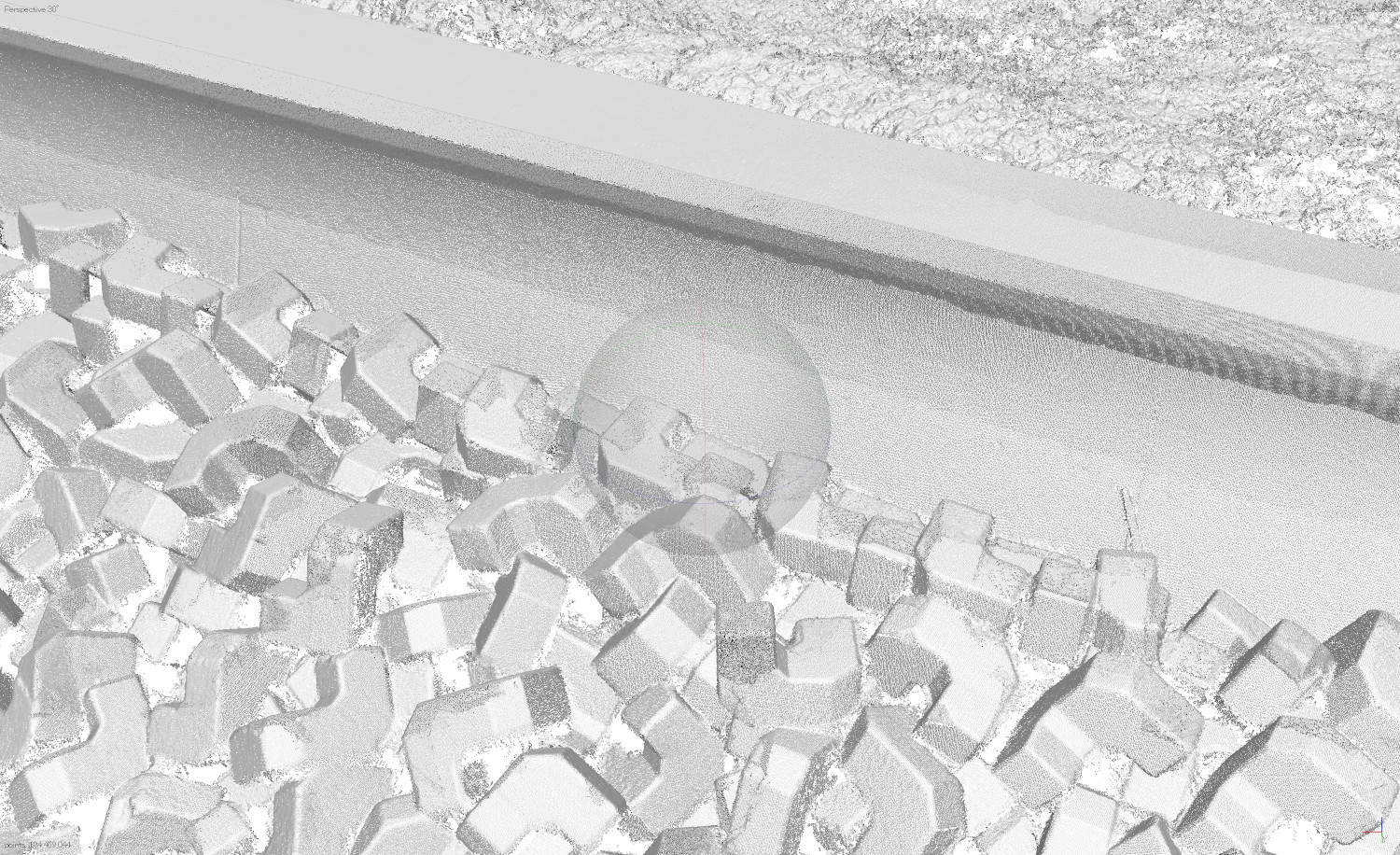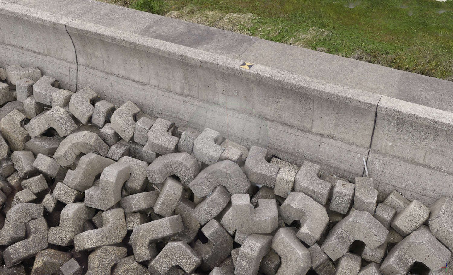 以下の写真は弊社保有の世界初の1億5000万画素高解像度デジタルカメラ「PHASEONE iXM-RS150F」で撮影し、Agisoft Matashape Proにて三次元モデル化したものです。撮影面積A=50,000m2 点群生成密度「中」にて約2億点の点群データです。
